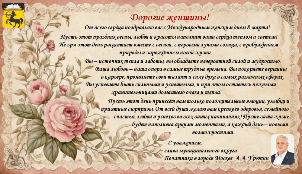 Дорогие женщины! 08.03.2026 От всего сердца поздравляю вас с Международным женским днём 8 марта! Пусть этот праздник весны, любви и красоты наполнит ваши сердца теплом и светом! Не зря этот день расцветает вместе с весной, с первыми лучами солнца, с пробуждением природы и зарождением новой жизни. Вы – источник тепла и заботы, вы обладаете невероятной силой и мудростью. Ваша любовь – наша опора в самые трудные времена. Вы покоряете вершины в карьере, проявляете свой талант и силу духа в самых различных сферах. Вы успеваете быть сильными и успешными, и при этом остаётесь нежными хранительницами домашнего очага и тепла. Пусть этот день принесёт вам только положительные эмоции, улыбки и приятные сюрпризы. От всей души желаю вам крепкого здоровья, семейного счастья, любви и успехов во всех ваших начинаниях! Пусть ваша жизнь будет наполнена яркими моментами, а каждый день – новыми возможностями. С праздником вас, дорогие женщины! С уважением, глава внутригородского муниципального образования - муниципального округа Печатники в городе Москве А.А. Урюпин