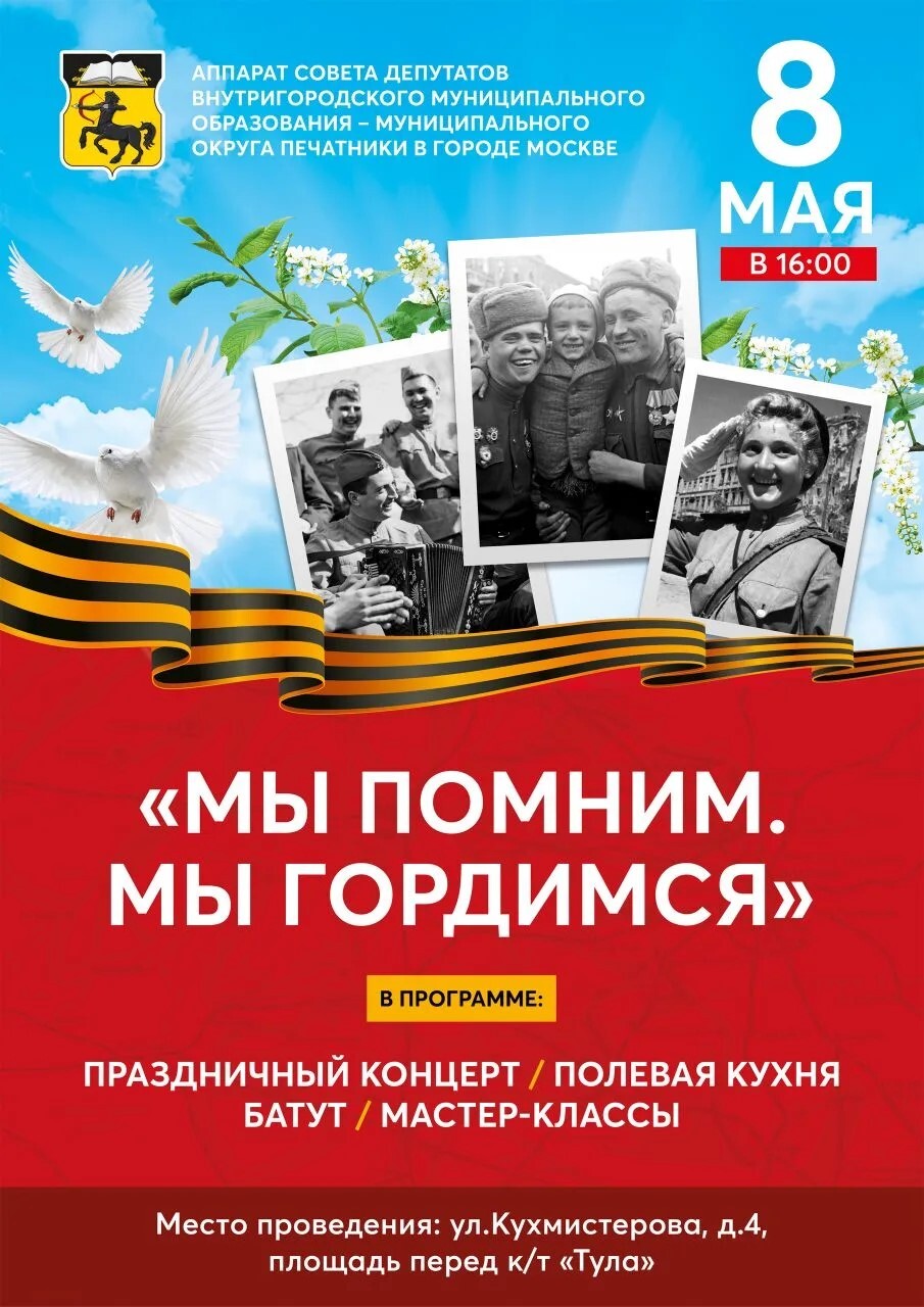 Уважаемые жители и гости столицы! 24.04.2026 Аппарат Совета депутатов внутригородского муниципального образования - муниципального округа Печатники в городе Москве приглашает вас на праздничное мероприятие, посвящённое Дню Победы в Великой Отечественной войне. В программе: праздничный концерт / полевая кухня / батут / мастер-классы Дата проведения: 08.05.2026г. Время начала: 16:00ч. Место проведения: ул.Кухмистерова, д.4, площадь перед кинотеатром «Москино Тула» Приходите всей семьёй с друзьями, чтобы вместе отметить этот светлый праздник и почтить память тех, кто защищал нашу Родину. Будем рады видеть вас на нашем мероприятии!