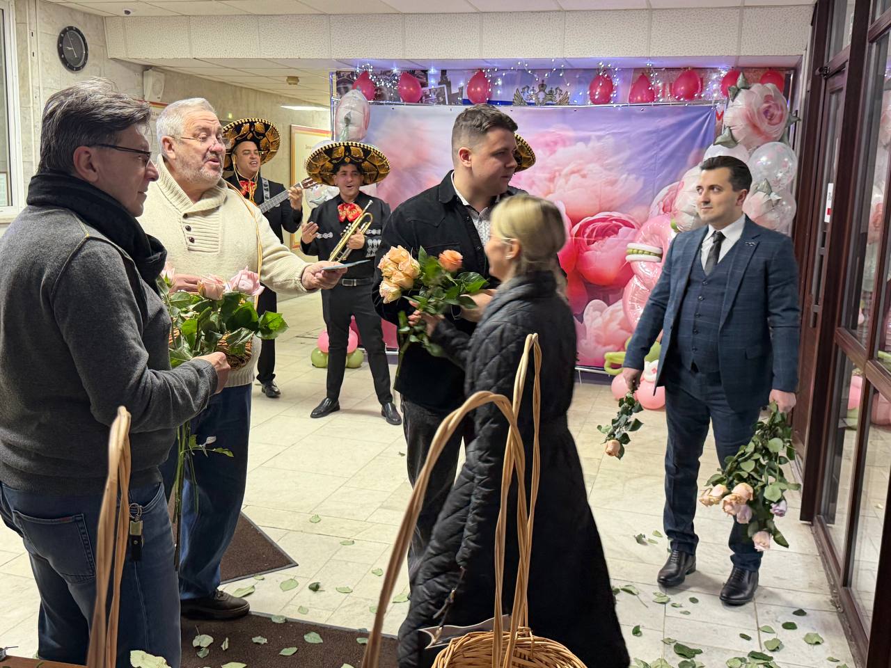 В праздничное утро в холле здания УВД по ЮВАО царила особая атмосфера. Сотрудники-мужчины, а также председатель Общественного совета при УВД по ЮВАО Олег Хатюшенко и член Общественного совета артист театра Ленком Марка Захарова Леван Мсхиладзе встретили женщин, чтобы поздравить их с Международным женским днем. Для каждой женщины, входящей в здание, были организованы приятные подарки и цветы. Праздничное настроение поддерживали музыканты, которые выступали в холле в национальных мексиканских костюмах и сомбреро, заряжая всех позитивной энергией. Они играли живую музыку на фоне специальной фотозоны, где каждый желающий мог сделать памятный снимок.