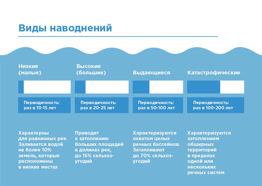 Паводок, половодье и наводнение. Есть ли разница? 17.03.2017 ПАВОДОК Паводок – это резкое увеличение уровня воды в реке или ином водоеме, возникающее в результате быстрого таяния снега, ледников или обильных дождей. Паводок может повторяться многократно в различные сезоны года. От наводнения паводок отличается своей кратковременностью и внезапностью. Продолжительность паводка от нескольких долей часа до нескольких суток. Следующие один за другим паводки могут образовать половодье. Значительный паводок может вызвать наводнение. ПОЛОВОДЬЕ Половодье – это высокий и длительный подъем уровня воды, обычно сопровождающийся выходом воды из русла на пойму. Половодье вызывается усиленным продолжительным притоком воды, который может быть обусловлен весенним таянием снега на равнинах, летним таянием снега и ледников в горах или обильными дождями. В отличие от паводка, имеет регулярный характер, повторяется ежегодно, в один и тот же сезон, хотя и с разной интенсивностью и продолжительностью. НАВОДНЕНИЕ Наводнение — затопление обширных территорий, которое было вызвано поднятием уровня воды в озёрах, реках, морях после выпадения обильных осадков, таяния снегов, прорыва дамбы, что привело к выходу воды далеко за границы береговой линии. Причиной выхода из берегов рек, озер и морей могут послужить обильные осадки, активное таяние снегов, таяние ледников, ветровой нагон воды на побережья. Наводнения приносят колоссальный ущерб человеку, потому как поток воды заполняет собой все и несет разрушения и смерть. В зависимости от силы наводнения и его интенсивности, угроза для жизни также бывает разной.